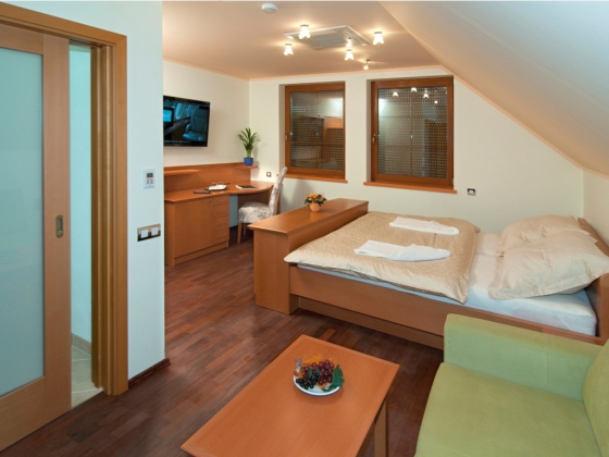 There are two spacious rooms in the apartment. The bedroom is furnished with a king-size bed, and the living room has a lounge set and a minibar. The apartment is also equipped with a separate bathroom and toilet, air conditioning, a refrigerator with a minibar, internet and satellite TV. And there is naturally a coffee and tea service.
