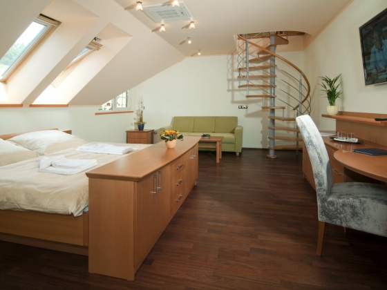 V apartmánu se nachází dva prostorné pokoje. Ložnice je vybavena manželskou postelí typu King size, obývací pokoj pak sedací soupravou a minibarem. Apartmán je dále vybaven samostatnou koupelnou s vanou, klimatizací, lednicí s minibarem, internetem a satelitní tv. Servis pro přípravu kávy a čaje je samozřejmostí.